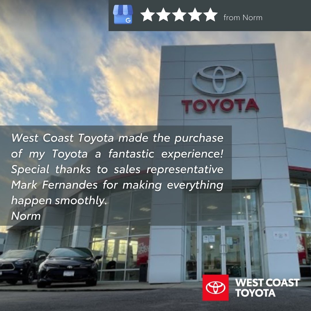 "West Coast Toyota made the purchase of my Toyota a fantastic experience! Special thanks to sales representative Mark Fernandes for making everything happen smoothly. Norm"