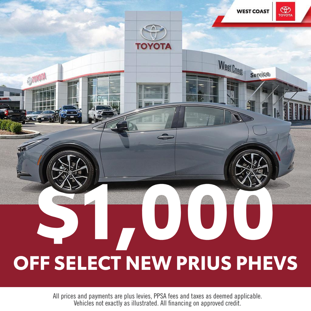 A10. Simply visit West Coast Toyota in Pitt Meadows this January, and the $1,000 discount will be applied to your purchase or lease of a new 2026 Prius Plug-In Hybrid.